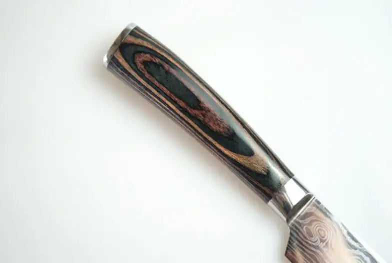 The blade is crafted from 7CR17 stainless steel with a stunning laser-etched Damascus pattern that’s sure to catch your eye. The workmanship is beautiful, the edge is razor-sharp, and it’ll keep your kitchen far away from dull, frustrating knives.